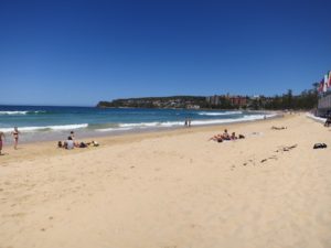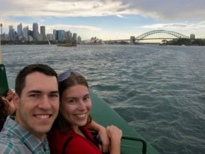 Our last day in Sydney was relaxing and exactly what we needed. We tried Vegemite for breakfast and definitely do not need to try that again. It was another beautiful day so we took the ferry to Manly Beach. The city views from the ferry were spectacular! We were able to view the Opera House, Harbour Bridge, and city skyline all in one shot. The ferry ride was about 30 minutes long, but only cost $15 AUD per person. Before hitting the sand we munched on the most delicious fish and chips and lathered up with sunscreen. The 80 degree air and sunshine felt amazing and it was great to relax on beach and doze off a little. Kyle talked me into swimming, and despite the chilly water, it was a blast. The waves were huge and it was fun watching the dozens of surfers hang ten. There was also a beach volleyball world tour tournament taking place. We stopped and cheered on the USA women’s team for awhile before catching the return ferry. The sun set over the city while we ate dinner on the Circular Quay boardwalk. We tried some of the local specialties: Sydney Rock oysters, lamb, and barramundi fish – YUM! Following dinner, we strolled the botanical gardens to view the Opera House lit up at night. It was magical. At last we could say we’d seen the sights of Sydney, so we took a ferry back to our AirBnB and packed up for our early morning flight.